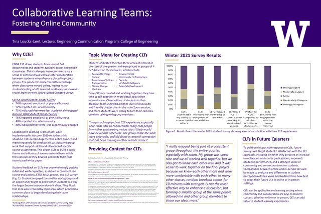 ENGR 231 draws students from several CoE departments and students typically do not know their classmates. This challenges instructors to create a sense of community as well as foster collaboration between students when they are placed in project groups. The pandemic exacerbated this challenge when classrooms moved online, leaving many students feeling adrift, isolated, and lonely.To overcome this challenge, I created Collaborative Learning Teams (CLTs) where students are placed in small groups early and remain together the entire quarter. CLTs meet frequently for breakout discussions and group work that supports skills and elements of specific course assignments, including peer reviews, document analysis, and topic analysis. Students choose areas of interest via a Canvas survey and are grouped based on these topics. CLTs provide students a means to discuss and coordinate their topics for course assignments with an eye to the final team assignment. This coordination allows CLTs to build a topic theme and a library of source material from which they can pull as they develop and write their team-based white paper.