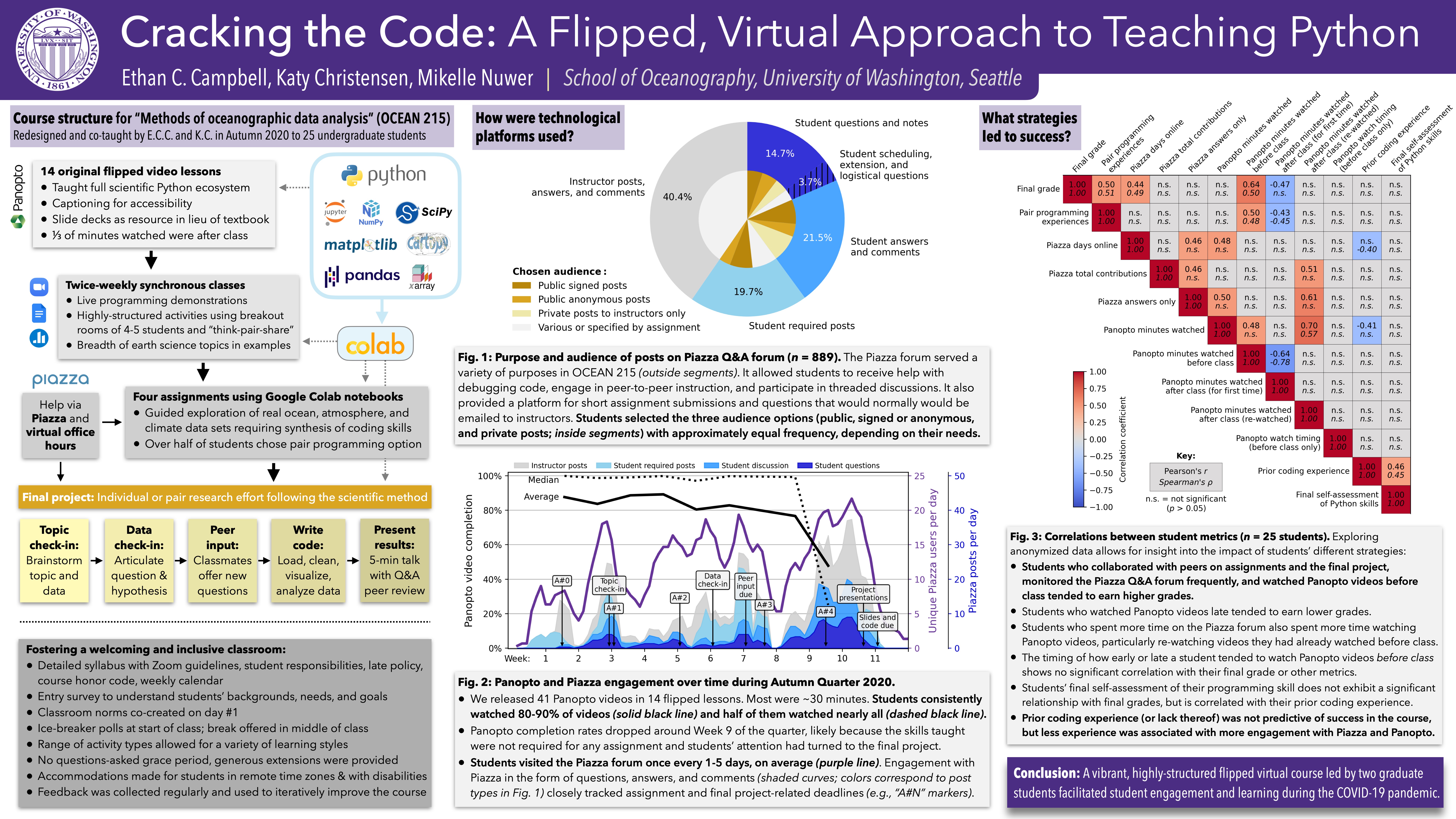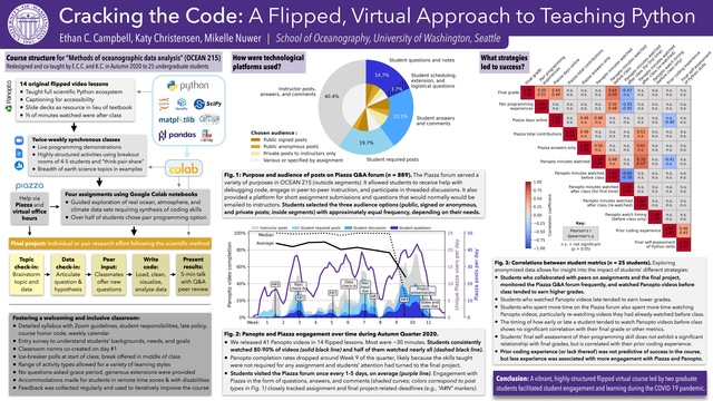 We completely redesigned an introductory UW Oceanography data analysis course (OCEAN 215) with the goal of equipping students to engage in scientific inquiry by writing code. Two graduate students co-taught the course to 26 undergraduates in a flipped, virtual format. Cloud-based Google Colab notebooks were used to access the full scientific Python programming ecosystem, which is ubiquitous in STEM disciplines and the data science industry. Highly-structured, collaborative in-class activities were infused with active learning techniques, which have been shown to improve understanding and retention of material (Freeman et al. 2014). Assignments incorporated examples from across the earth sciences, with sufficient scaffolding provided to ensure accessibility from diverse backgrounds. A capstone project guided students through the scientific method in miniature, from forming hypotheses to obtaining data, conducting analyses, exchanging feedback with classmates, and presenting results.