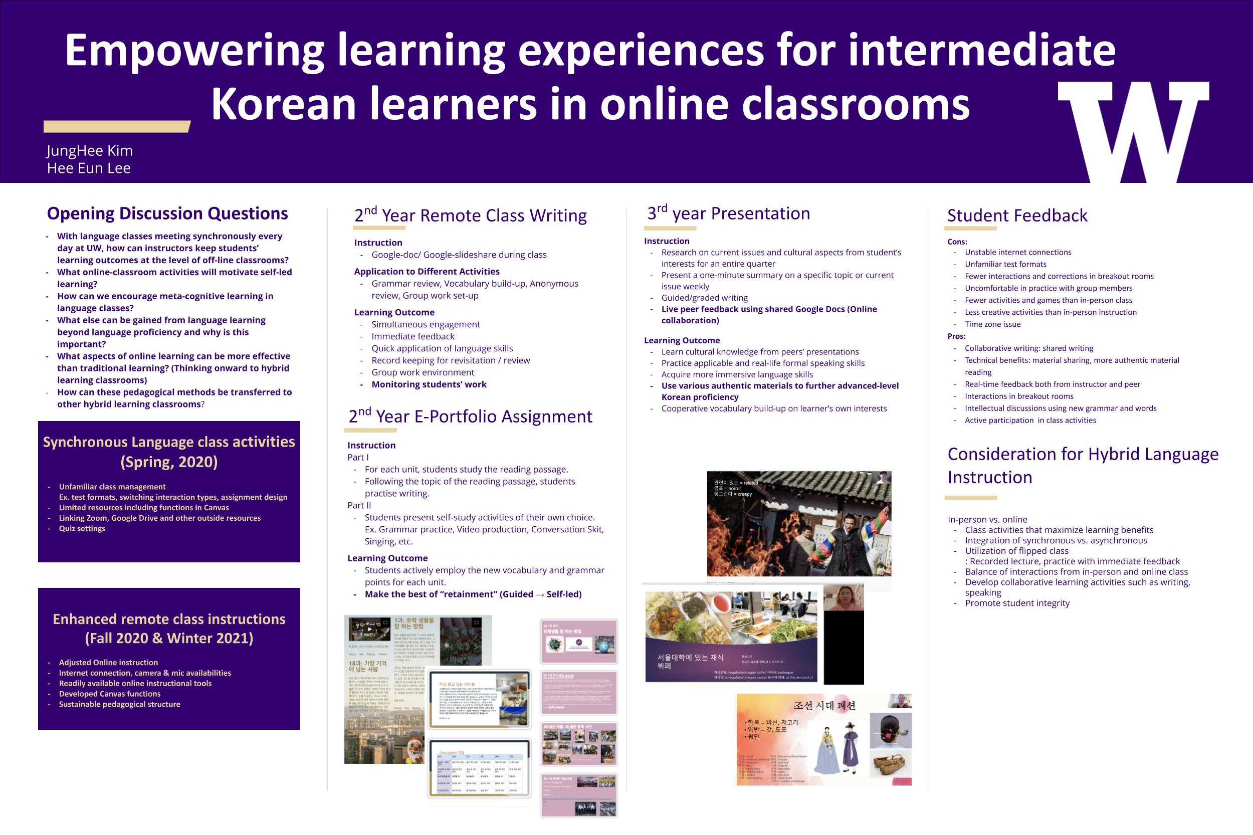 Online teaching and learning have ineffably become more important since the last year’s break out of the pandemic. With language classes meeting synchronously every day at UW, instructors had to come up with measures that would keep students’ learning outcomes at the level of off-line classrooms. Based on the class activities collected from 2nd year and 3rd year Korean students, this poster shows various pedagogical methods that created active learning experience in online language classes for intermediate language learners. By implementing these pedagogical methods, some even proved to be more effective online.The poster presents various activities to illustrate how online learning can motivate self-led learning. Included here are pedagogical strategies such as collaborative writing, e-Portfolio and weekly cultural presentation assignments that encourage meta-cognitive language learning. These methods certainly enhance the basic language skills but students are able to embrace the culture of the language at the same time. Proficiency in a language then becomes more than simply a communicative tool but an in-depth bearing of social and cultural understanding.