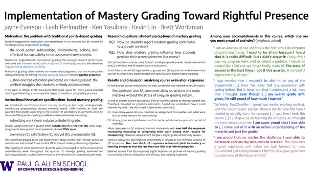 The design of instructional assessment ecology can affect student engagement, motivation, and experience in a course. Research has shown that traditional, single-attempt, points-based grading can increase anxiety and avoidance of challenging courses (Chamberlin 2018). Rather than serving to motivate students, traditional grading can demotivate students and reinforce negative self-assessments of ability (Gorson and O’Rourke 2019). Traditional grading that emphasizes normative value judgments is incompatible with frameworks for moving “beyond equity as inclusion” and towards rightful presence (Barton and Tan 2020): justice-oriented teaching and learning predicated on the deconstruction of oppressive power dynamics. While changing grading practices alone is not sufficient to achieve rightful presence, it can be a necessary first step towards creating a more just and equitable classroom.This poster describes our experiences with specifications-based mastery grading (Talbert 2017, Nilson 2014, Feldman 2018) in two large, undergraduate introductory programming courses enrolling nearly 1,400 students in total. Rather than averaging together point scores from multiple assignments, final grades were awarded based on the number of satisfactory assignments completed by the end of the quarter. Smaller assignments were graded either satisfactory (S) or not yet (N), while larger assignments were graded on an expanded, 4-level scale. Students were given the opportunity to revise and resubmit any unsatisfactory work at regular intervals throughout the quarter.