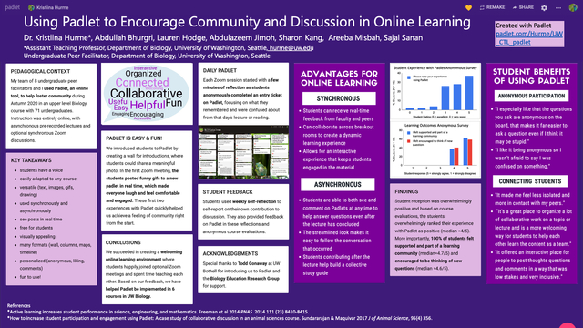 Students are most receptive to new material if given the opportunity to work with others and improve their understanding. Padlet gives instructors the opportunity to both control discussion around the new material, but also let students clarify what they thought was most challenging. Padlet can be easily adapted to any course, and based on our feedback Padlet is already being implemented into multiple Winter biology courses.