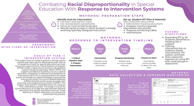 This project aims to create a systemic change within schools and interrupt the disproportionate referral of students of color for special education services. The school uses the Multi-Tiered Systems of Support (MTSS) model, a data-driven structure designed to support students equitably. Within MTSS, the support provided to students prior to a special education evaluation is referred to as Response to Intervention (RTI). RTI is implemented in six-week cycles with evidence-based strategies and progress monitoring using Curriculum-Based Measures (CBMs). Schools continuously struggle with planning and implementing school-wide RTI. This project illustrates RTI implementation at a diverse, Title I elementary school. This study is crucial for future educators to bridge the gap between general education and special education services. Those teaching in higher education can powerfully accelerate this process.This study is informed by prior research that supports RTI as a fundamentally data- and team-driven program that aims to reduce the number of students referred for special education services in order to enhance student outcomes via progress monitoring and curriculum-based measurement (Brown-Chidsey & Steege, 2005; Hosp, Hosp & Howell, 2016; McIntosh & Goodman, 2016). Evidence suggests that RTI has positive effects on reducing bias in assessment for students from diverse backgrounds. This reduction in the disproportionate placement of Black students in special education has a positive impact on academic and behavioral performance (Marston et al., 2003).
