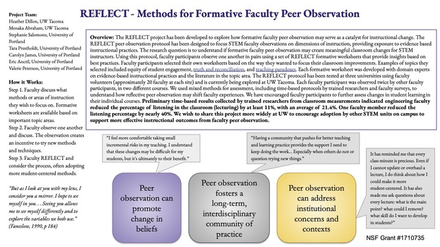 The REFLECT protocol has been tested at three universities using faculty volunteers (approximately 20 faculty at each site) and is currently being explored at UW Tacoma. Each faculty participant was observed twice by other faculty participants, in two different courses. We used mixed methods for assessment, including time-based protocols by trained researchers and faculty surveys, to understand how reflective peer observation may shift faculty experiences. We have encouraged faculty participants to further assess changes in student learning in their individual courses. Preliminary time-based results collected by trained researchers from classroom measurements indicated engineering faculty reduced the percentage of listening in the classroom (lecturing) by at least 11%, with an average of 21.4%. One faculty member reduced the listening percentage by nearly 40%. We wish to share this project more widely at UW to encourage adoption by other STEM units on campus to support more effective instructional outcomes from faculty peer observation.
