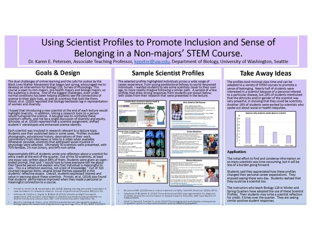 Priniski, et al. (2018) also found that students’ performance improved when they made a personal or meaningful connection to a course. My scientist profiles took minimal class time and can be adapted to a variety of STEM courses to promote a sense of belonging.