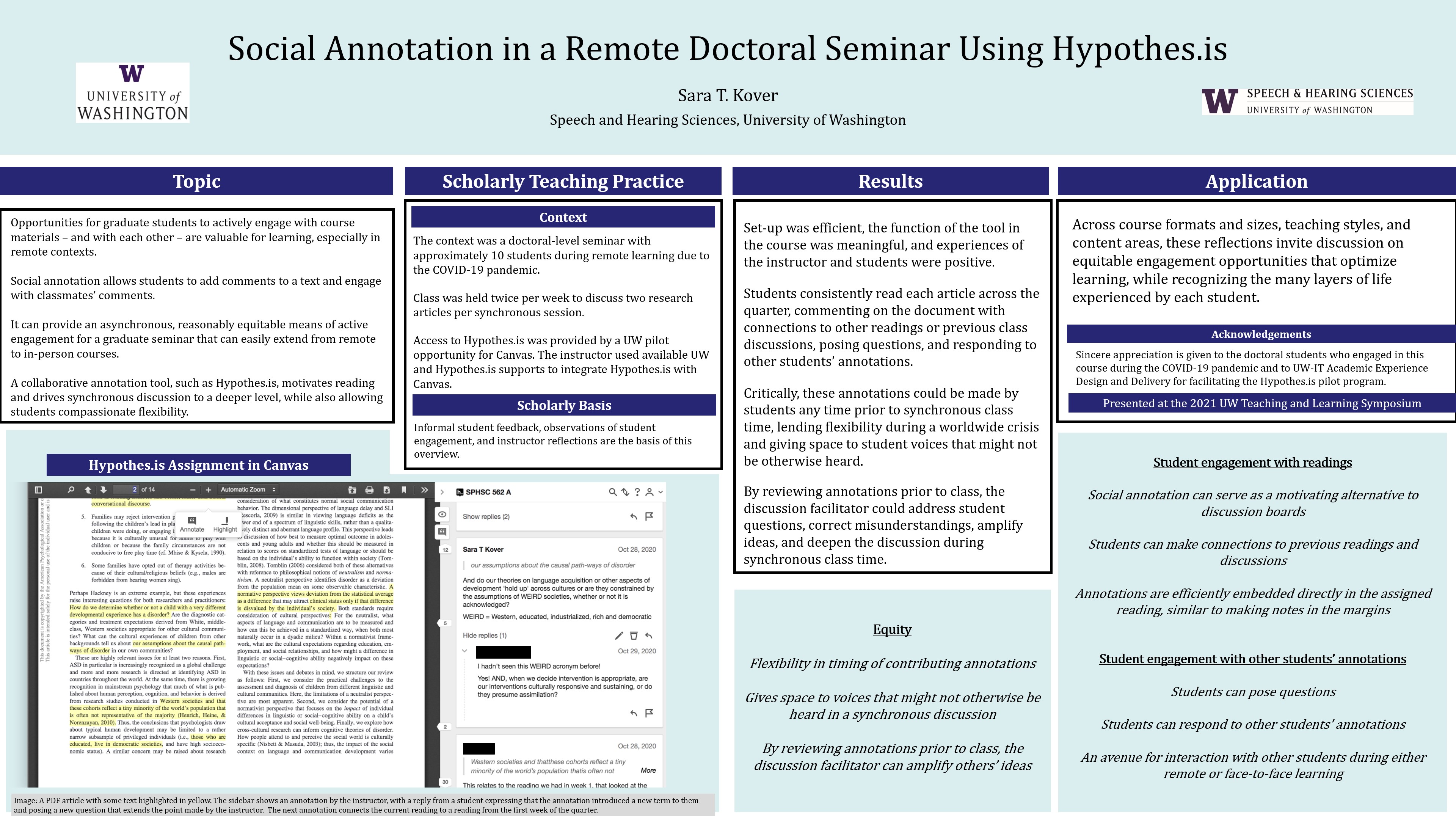 Opportunities for graduate students to actively engage with course materials – and with each other – are valuable for learning, especially in remote contexts. Social annotation allows students to add comments to a text and engage with classmates’ comments. It can provide an asynchronous, reasonably equitable means of active engagement for a graduate seminar that can easily extend from remote to in-person courses. A collaborative annotation tool, such as Hypothes.is, motivates reading and drives synchronous discussion to a deeper level, while also allowing students compassionate flexibility. The context was a doctoral-level seminar with approximately 10 students during remote learning due to the COVID-19 pandemic. Class was held twice per week to discuss two research articles per synchronous session. Access to Hypothes.is was provided by a UW pilot opportunity for Canvas. The instructor used available UW and Hypothes.is supports to integrate Hypothes.is with Canvas. Informal student feedback, observations of student engagement, and instructor reflections are the basis of this overview. Set-up was efficient, the function of the tool in the course was meaningful, and experiences of the instructor and students were positive. Students consistently read each article across the quarter, commenting with connections to other readings or previous class discussions, posing questions, and responding to other students’ annotations. Critically, these annotations could be made by students any time prior to synchronous class time, lending flexibility during a worldwide crisis and giving space to student voices that might not be otherwise heard. By reviewing annotations prior to class, the discussion facilitator could address student questions, correct misunderstandings, amplify ideas, and deepen the discussion during synchronous class time. In terms of application, across course formats and sizes, teaching styles, and content areas, these reflections invite discussion on equitable engagement opportunities that optimize learning, while recognizing the many layers of life experienced by each student.Poster PDF
