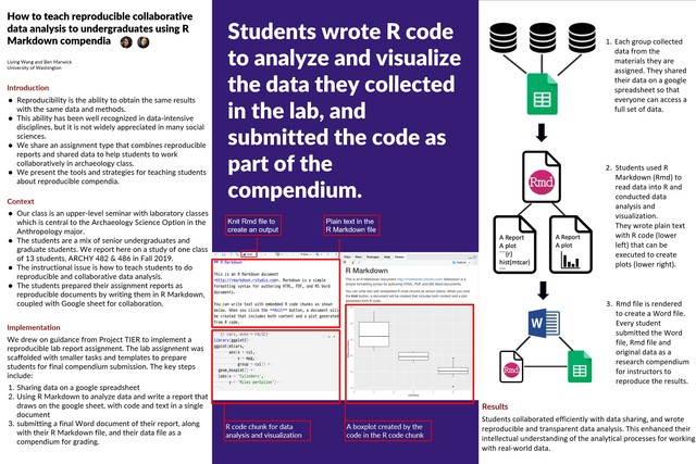 We share an assignment type that combines reproducible reports and shared data to help students to work collaboratively in archaeology class. We present the tools and strategies for teaching students about reproducible compendia.