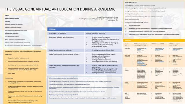 Moving to remote learning has caused insurmountable challenges for visual art education. This presentation will discuss ways to advance student learning in online learning environments in the Arts by looking at specific methodologies and assignments from a variety of interdisciplinary studio classes taught during the Covid pandemic.We will compare the regular face-to-face curriculum with remote learning, and see which types of classroom assignments, digital platforms, and learning tools has worked best for improving student engagement and learning. We will discuss viable virtual alternatives to traditional art practices, such as the online gallery exhibition, a co-authored class publication using Pressbooks, and class projects designed for Zoom and led by the students. We will see how the distance learning environment can facilitate a shift away from the finished product towards prioritizing experimentation and exploration, while also increasing opportunities for the students to reflect on their own creative journey. We conclude that the benefit of working through remote learning can be a form of education that is better tailored to the individual student's needs, and that students actually welcome the opportunity for increased accountability for their own progress, and for moving each other and the entire class forward.