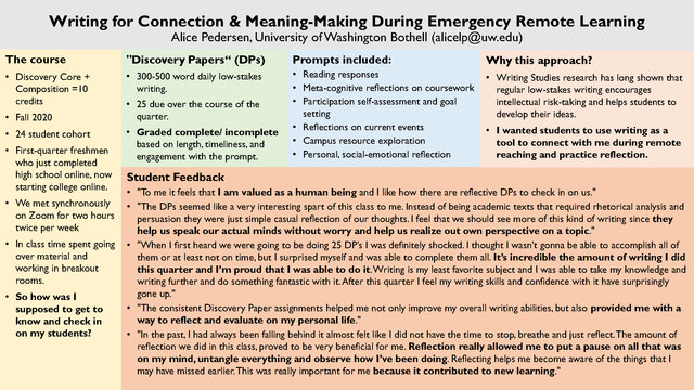 Every fall I teach a cohort-model course that links two required courses, Composition and UWB’s first-year course, Discovery Core, for a total of 10 credits. When reimagining this course for emergency remote learning, I centered reflective writing at the heart of both courses. While low-stakes writing is common in Composition classrooms, the regularity of the assignments and the range of prompts was new; in this class, the approximately 250-word “Discovery Papers” (DPs) served as the primary mode for student engagement. Students wrote 25 DPs over 10 weeks, with topics ranging from reader responses to participation self-assessments to mental health check-ins. While I was the primary audience, students were also invited to share these on ungraded Discussion Boards. In this poster, I share my course design, selected prompts, and student response. Overall, students found the experience of intensive yet low-stakes writing to be gratifying. In final portfolios and course evaluations, students reflect that the experience helped them feel connected to me, even remotely; helped them to prepare and focus for synchronous sessions; and helped them to process what they were experiencing. As one student wrote: “I like how there are reflective DPs to check in on us … it feels that I am valued as a human being.” This poster examines what it means to value the human being during emergency remote learning, and how writing can enable that connection. It is established that regular short writing provides meaningful opportunities for students to take intellectual risks; here I demonstrate that it also allows space for connection and personal meaning-making even in disorienting and difficult times. While this poster speaks most immediately to those who work with first-year students, it will benefit any instructor who wants to surface personal and affective connections between the students, the material, and the classroom as community.Poster PDF