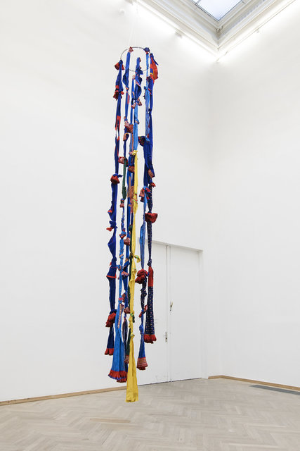 This textile installation combines cultures. It is made up of Sámi clothing that has been twisted and tied into a quipo form, an ancient recording system of strings and knots used by cultures in the South American Andes. Both are cultures that have gradually begun to disappear over time, so this piece seeks to honor both cultures and showcase how indigenous communities are disproportionately and negatively affected by the climate crisis, no matter the hemisphere.