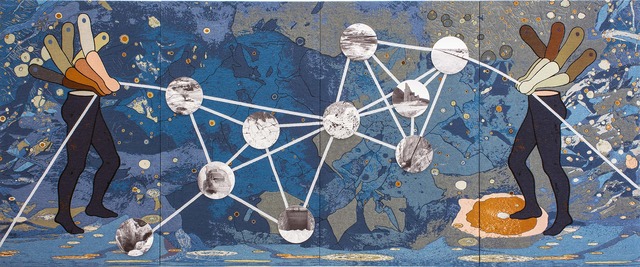 This set of four woven tapestries was created after the artist visited the Namibia mines. After witnessing the disastrous aftermath from the heavy extraction in the area, she was inspired to create a piece that draws attention to the consequences of such heavy extraction, both on the land itself and on the people’s bodies, minds, and emotions. Her work serves as a reminder that it was the aggressive mining techniques of the German colonizers that sparked the disastrous effects, showcasing how external forces can act as invasive species and leave scars strewn across entire communities.
