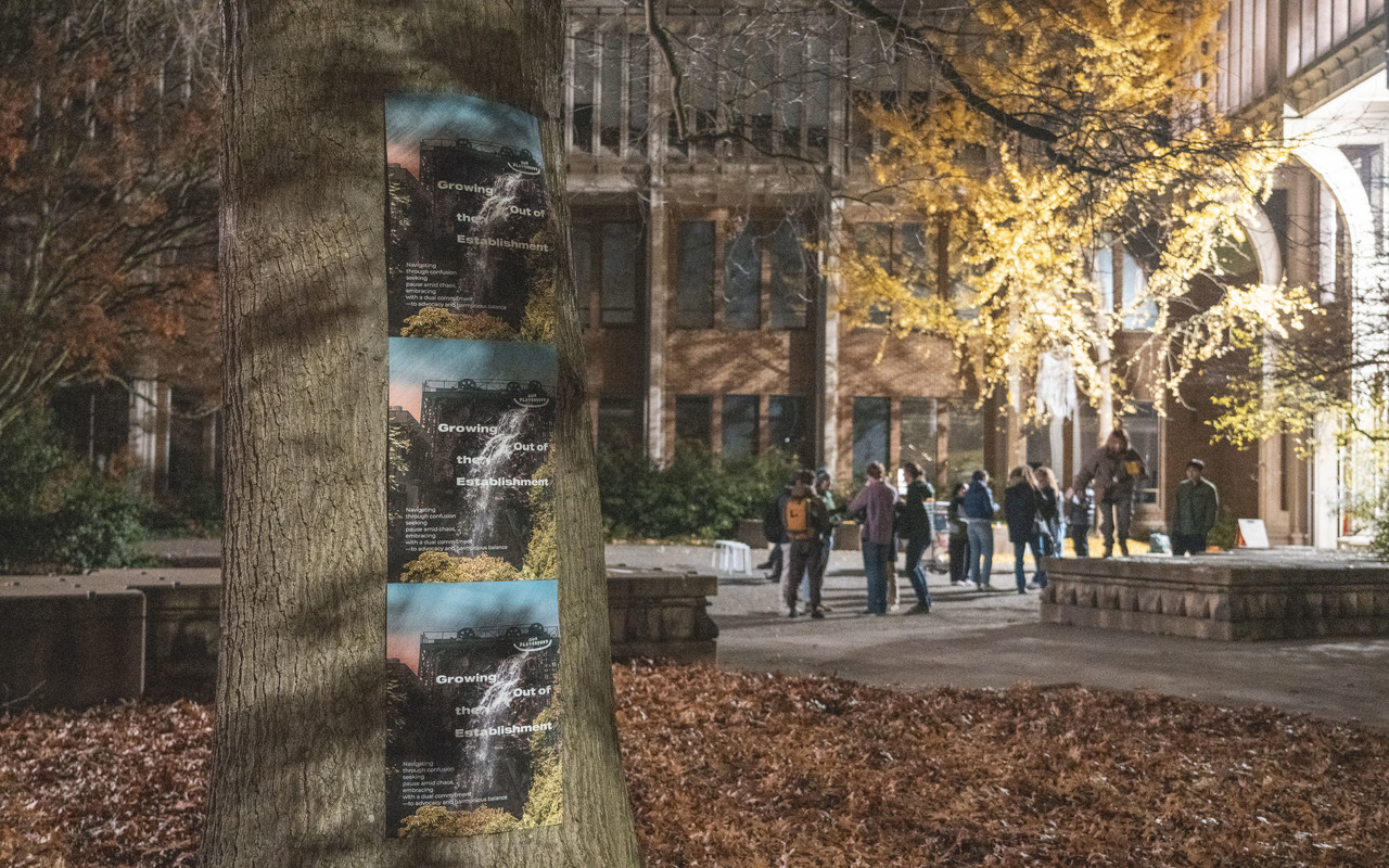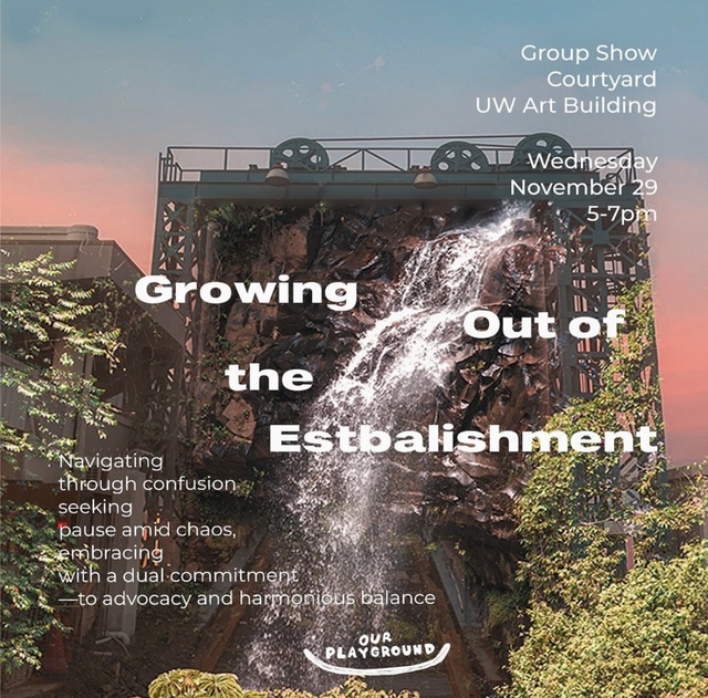 Growing out of Establishment is an exhibition held in the courtyard space of the University of Washington Art Building. The project initiators, Rosaline Dou and Megan Lam, use the courtyard as a poignant metaphor for urban nature and make the case that we humans are incomplete without it. Through a physical and conceptual roadmap, the exhibition guides the viewer on a shared journey to unpack the autoethnographic narrative of climate change and its impact on existing institutions.