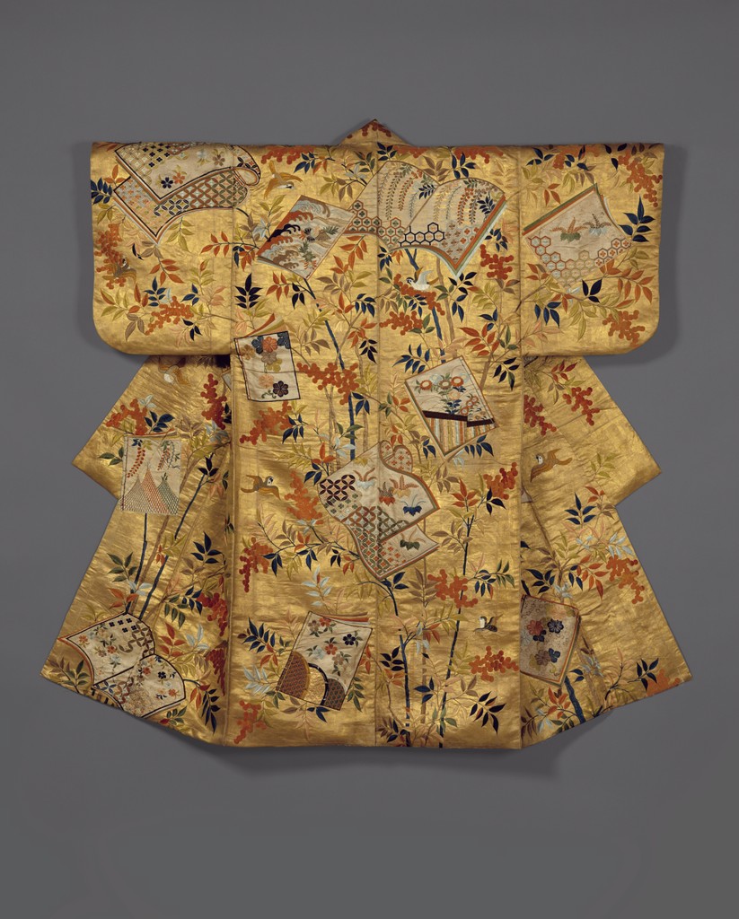 This is a nuihaku, a kosode type of Noh costume meant for the inner garment. It also refers to the metallic leaf and embroidery techniques used to create them. The patterning on this garment features books and Nandia branches. The red of the berries on the branches promotes youth, and the gold background evokes the aristocratic, so this would have been worn by an actor to play an upper-class woman. The books also evoke the aristocratic attitude in a similar sense, also referencing well-known literacy such as The Tale of Genji. Again, it was a costume for a female role and played by a male actor. Noh performances were not just meant for entertainment, but also aimed to educate women and young people that were able to watch these performances (Denney 123). So, the references to the aristocratic can be understood to show this audience what they should ideally be, through the association of the actor’s dress and performance.