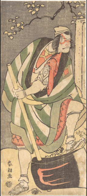 Hokusai’s signature on this portrait reads “Shunrō ga” in which suggests that he studied under the Katsukawa school. This print is a prime example of the skill and style Hokusai had acquired and works he would produce during his time as a student of his first master, Katsukawa Shunshō. That is, he would produce woodblock portraits of kabuki theatre actors striking a mie or their characteristic poses in the narrow single-sheet (hosoban) format (Yonemura, 45). Hokusai was faithful to the house style created by his master with emphasis on the actors’ distinctive physical and personality features as seen here in this print depicting an actor in a scene from the kabuki play The Golden Hilt Ornament and Square Sword Guard of the Minamoto Family (Kin no menuki Geneke no kakutsutab), where the monk Mongaku is disguised as a bandit, which was performed at the Ichimura Theater in 1791 (Yonemura, 45).