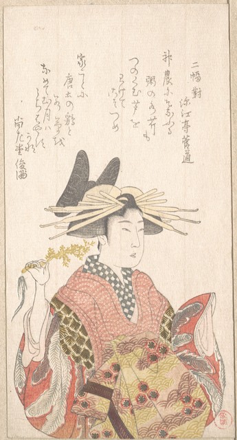 The work above depicts a Courtesan from the waist up. This close look allows for the focus to be on the detailed kimono and hairstyle of the Courtesan. Kimonos have become quintessential of Japanese fashion and there are many different elements to a kimono that allows for differentiation. These things include: the folding of the layers, colors, patterns, fabric type, method of production, etc. The Courtesan above is a prime example of the eye-catching kimonos women would wear in the Yoshiwara district. Courtesans certainly began fashion trends as the Yoshiwara district was a hub for new styles in Japan. The kimono has elements of red and green which are highly sought after colors due to their cultural significance. Green being symbolic of the virtuous gentleman and red being symbolic of high rank. Additionally, the blend of patterns in the kimono added to their allure as it was a highly coveted skill to be able to mix and match different colors and patterns in the layers of the kimono. The Courtesan’s hair is done in a traditional hairstyle called Yoko Hyogo, this hairstyle uses pins and accessories to keep the hair up. This style was iconic of courtesans, especially those high in rank. Furthermore, the Courtesan is holding a branch of Seri, which is an herb used traditionally for herbal medicine in Japan. The Courtesan holding an herb of such significance also aids the idea of her high social standing as she is in contact with these items.