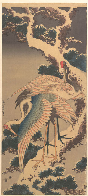 Katsushika Hokusai Cranes on Branch of Snow-covered Pine, late 1820s Woodblock print; ink and color on paper 20 3/8 x 9 1/8 in. (51.8 x 23.2 cm)