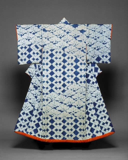 The Kosode here is made from a silk satin and the design was made from a very specific dyeing technique known as Kanoko Shibori which means (to squeeze). the process is similar to how we would tie dye a shirt, the process begins with twisting and compressing the garment into s specific shape and tied then it would be dyed creating a pattern. Kosode's with patterns similar to this one would be very expensive as the technique was very time consuming, so garments like these would be very essential to the higher class such as the wealthy merchants, it's also said that Kosodes being covered with this type of pattern was a very luxurious.