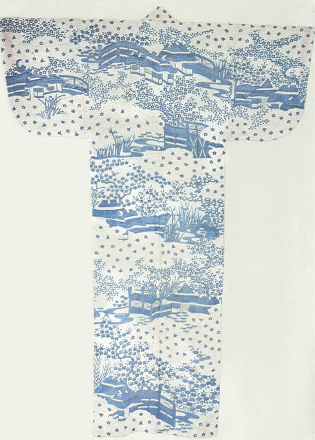 17th Century Summer Kimono. Early Edo era dress, as the sleeves are shorter as compared to later Edo era Kimonos in which the sleeves are longer. Patterns on the dress include a traditional home with bridges and gardens, and carefully placed flowers. Light indigo color dyed in the Ohayatsuji method on white fabric. The Ohayatsuji method, was derived from scrunching the fabric in certain ways to create patterns.
