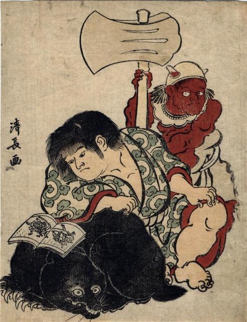 "Kintaro Reading an Ehon on the Back of a Bear Accompanied by an Oni Holding an Ax" (ca 1784-1806), Torii Kiyonaga (1752-1815)