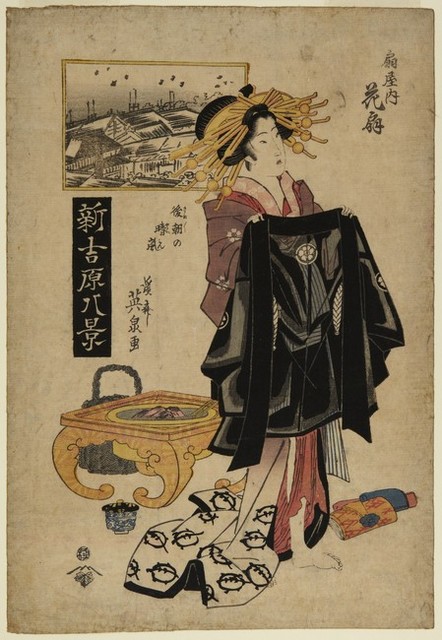 One of Eight Views of the Yoshiwara is about a high level courtesan more specifically an Oiran that is washing a samarias black garment. Due to the distinct hairstyle of the Oiran called the Datehyougo,you could always point out an Oiran. Women no matter what stage or rank they're in have to ultimately be less than a male. This is a symbol of the cultural standings of women at the tims and how their purpose was to satisfy a male.These women were always a part of the working class, even if they were the highest ranked courtesans with intellectual knowledge in literature and arts.