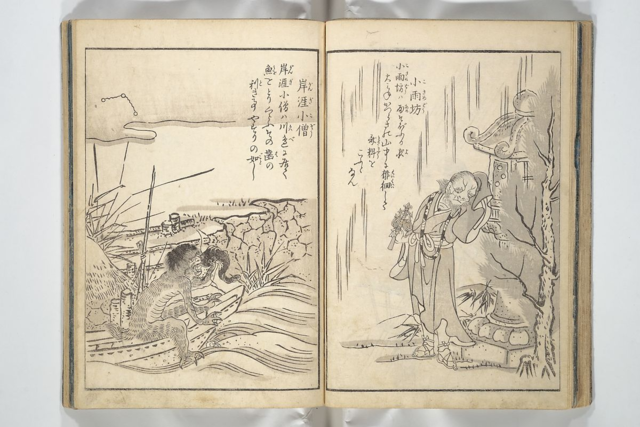 This piece represents the efforts Toriyama Sekien took in finding youkai and monsters from oral form, categorizing, and visualizing them in collections to be referenced long into the future. During the Edo Period, Toriyama's collections of youkai provided inspirations to famous artists like Katsushika Hokusai and Tsukioka Yoshitoshi, whose works of monsters and yurei are also on display here. In this print, we can see two youkai depicted. Gangi-kozo (left), translated as "riverbank priest boy", is said to inhabit rivers where they hunt for fish. Strongly resembling kappa, their bodies are covered in hair, with a dark patch on their head. Their feet and hands are webbed, with each finger ending in sharp claws. It is said that if a fisherman were to encounter ganji-kozo, they would offer it their largest fish to ward it off. On the right is a youkai known as Kosamebou, or ”light rain monk". These commonly appear as Buddhist monks and reside on empty mountain roads on nights where light rain is falling. Though frightening in appearance, kosamebou are not dangerous, only sometimes asking for spare change and millet from passing tourists and travelers. Throughout my research into Toriyama's work portraying the youkai here, most of the information about the origins about them were attributed to Toriyama himself, leading me to believe his works in One Hundred Monsters Ancient and Modern and his other volumes were crucial in keeping the stories of Gangi-bozo and Kosamebo alive, as well as every other youkai he came across.
