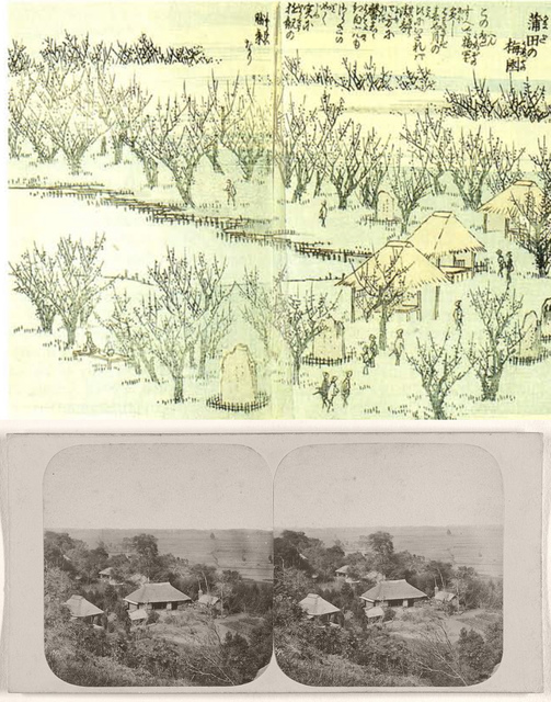 Utagawa Hiroshige (1797-1858), Plum Garden Kamata, from the book, Elon Edo Miyage, vol. 2, 1850, Woodblock Print, Height 18cm, Width 21cm, Image Courtesy of Columbia University / View of The Emperor’s Sporting Quarters, at Odji, ca. 1853. Photo by Pierre Rossier / Negretti & Zambra. Image Courtesy of University of Nagasaki via Old Photos Japan