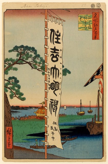 The Banners of Sumiyoshi Festival on an Island that displays a sense of a standing center staged shape of a photography composition. From this center stage white silhouette banner, you see the calligraphy within the flag showing importance to what’s being said within the banner. The viewing lens of a festival its is important it commemorating to festival held in the twenty-ninth day of the Sixth Month in 1646 and every third year thereafter. Even so the banner holds dear to the Sumiyoshi Shrine and holds more significance from this print as well.