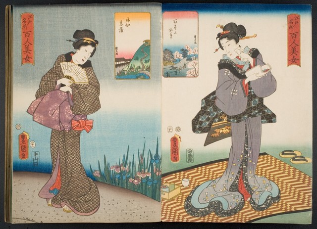 These two prints are part of a series by Utagawa Kunisada, who designed the beautiful women in the front, and a small collaboration with his pupil Utagawa Kunihisa II (1832-1891), who tended to designing the landscape cartouches. Although the identities of the women are unknown, a lot can be inferred based on elements such as the blackening of teeth known as ohaguro and the shaved off eyebrows known as hikimayu. Such subtle traits indicate that the woman on the left was likely married. Their kimonos and hair accessories also vary greatly in pattern and formality but are of a high quality inaccessible to lower classes. The woman on the right is embellished with larger hair accessories, her kimono appears to contain more layers, and her obi is a bit more lavish. It can be assumed that the settings these women are in are the same locations as the smaller cartouches they are being compared to, essentially personifying these charming scenes of Edo.