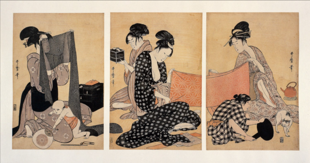 A group of respectable married women, surrounded by their children and even a pet cat are working together on a hot summer's day folding and mending obi sashes. On the right, two of them stretch and fold a red silk sash tie-dyed with a white 'starfish' pattern while a young boy plays with the cat in the foreground. In the middle back, a woman holds what looks like a mesh or a wire box. On the left, a woman holds and inspects a sheer black obi with a child in her lap.