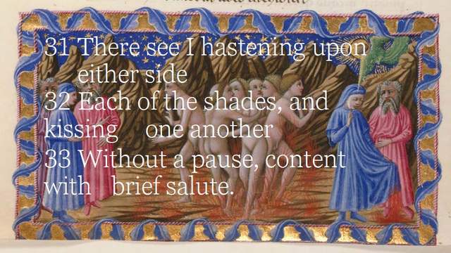 One of the few images of purgatory 26 showing the tercets that have spurred contemplation and debate over the centuries, and shows again how Dante does not let us off the hook. It forces us to accept the nuance and contradiction inherent in life. Another beautiful image that reinforces the idea of intent over action and the supremacy of love from lust.