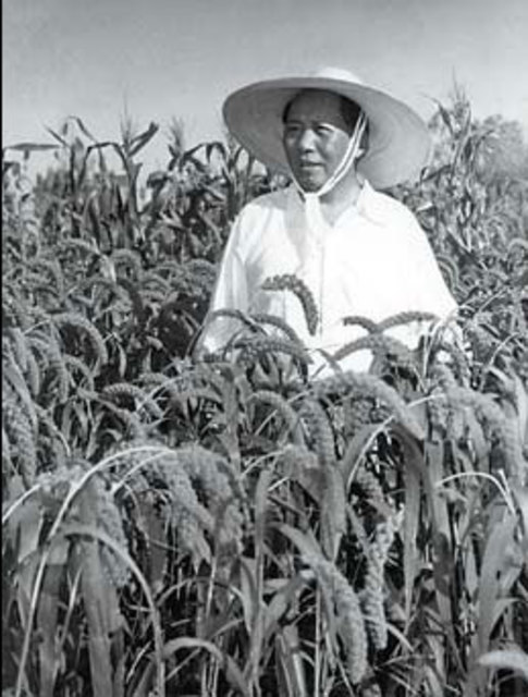 This black-and-white photograph of Mao Zedong inspecting fields ready for harvest at the start of the Great Leap Forward was taken in 1957. The original image included Vice Chairman Liu Xiaoqi. Official photographic retoucher Chen Shilin removed Liu from the image and drew plants to cover the space where he once stood. A colorized version of the photograph became a widely circulated propaganda poster.
