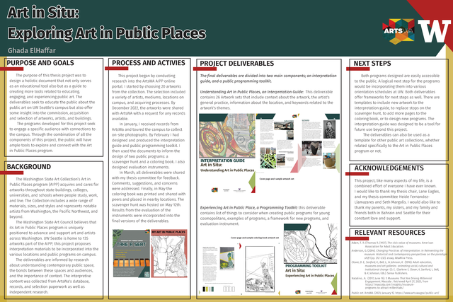 The Washington State Art Collection’s Art in Public Places program (AIPP) acquires and cares for artworks throughout state buildings, colleges, universities, and schools where people study, work, and live. UW Seattle is home to 135 artworks in 39 locations. Art in Situ: Exploring Art in Public Places is a holistic document that not only serves as an educational tool also but as a guide to designing more tools related to educating, engaging, and experiencing public art. The deliverables seek to not only educate the public about the public art on UW Seattle's campus but also offer some insight into the commission, acquisition and selection of artworks, artists, and buildings. The final deliverables are divided into two main components; an interpretation guide, and a public programming toolkit.