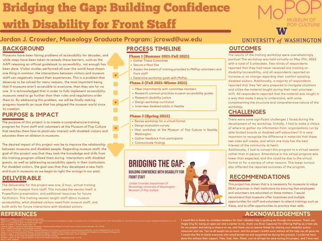 Museums are often seen as beacons of social progress but hidden behind the curtain is a damaging stain: inaccessibility. While much progress has been made in this sector, the attention is often focused on physical structures and not the attitudes of staff. This project utilizes findings from prior published visitor study research, disability justice publications, and interviews disabled individuals within the Seattle area. The purpose of this project is to create an employee training workshop for volunteers and front staff, as well as a resource guide for others to consult after the initial workshop. The goal of this project is to educate workshop participants on the basics of disability justice and provide them with information to improve their interactions with disabled guests. The results from self-reported surveys were positive, with respondents reporting that the information in the workshop was taught well and gave them the confidence and tools for future interactions with disabled guests. Some challenges faced during this process included pivoting to an online format due to COVID-19, low attendance, and determining what research sources to use when creating the program curriculum. Regarding the results obtained from this project, it is quite clear that museums and similar cultural institutions need to put resources towards training their employees in areas of social issues, such as accessibility. If programs such as this one become more common, it will lead to a more informed and conscious employee pool that is better equipped to assist all visitors.