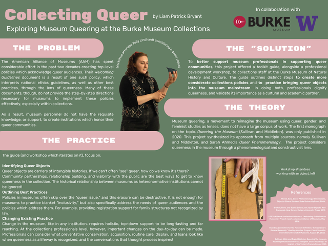 The use of women, gender, and sexuality studies as a way to understand museums is a very new perspective for the field. This process—most often called “museum queering”—produced its first monograph in 2020 with Sullivan and Middleton’s, Queering the Museum. Considering the novelty of this work, its practical applications have yet to be explored in full. There is especially little work in understanding how these theories interact with objects, belongings, and specimens in museums, let alone how collections professionals can apply this study to their work. “Collecting Queer” considers the ways in which collections professionals can consider queer object in their museums, through traditional and novel museological lenses. This project produced a toolkit-guide which adapts and synthesizes federal guidelines, relevant theory, and current research into a step-by-step guide for collecting queer objects. This work was applied to the Burke Museum of Natural History and Culture in the form of professional development undertaken by collections, education, interpretive, and administrative staff. In completing training in this material, attendees expressed higher comfort and enthusiasm in engaging with it in a day-to-day level. The content of “Collecting Queer” is built to be re-interpreted in other galleries, libraries, archives, and museums as an introductory text for more robust literature to come.