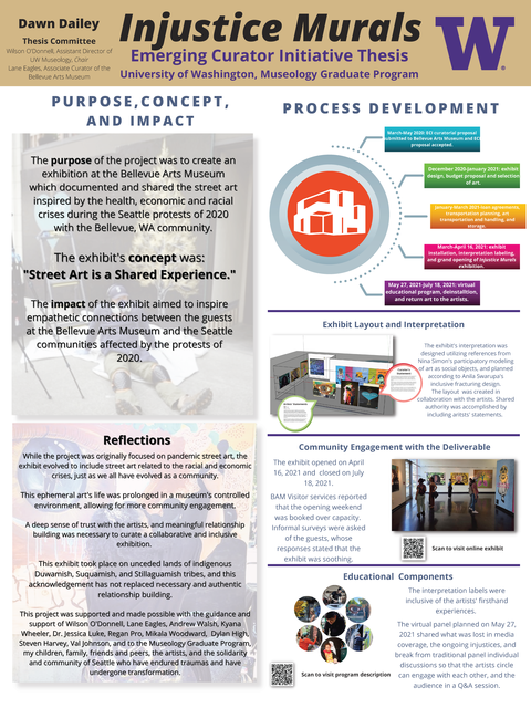 The purpose of this project was to curate a contemporary art exhibition that documented and shared the street art for the Bellevue Community inspired by the health, economic, and racial crises during the Seattle protests of 2020. The exhibition aimed to inspire empathetic connections between the guests at the Bellevue Arts Museum and the Seattle communities affected by the protests of 2020. The exhibit consisted of eight murals created by seven diverse artists that created street art that addressed the coronavirus pandemic and the BLM movement to foster empathetic, educational engagement with the Bellevue audiences that attended the exhibition.