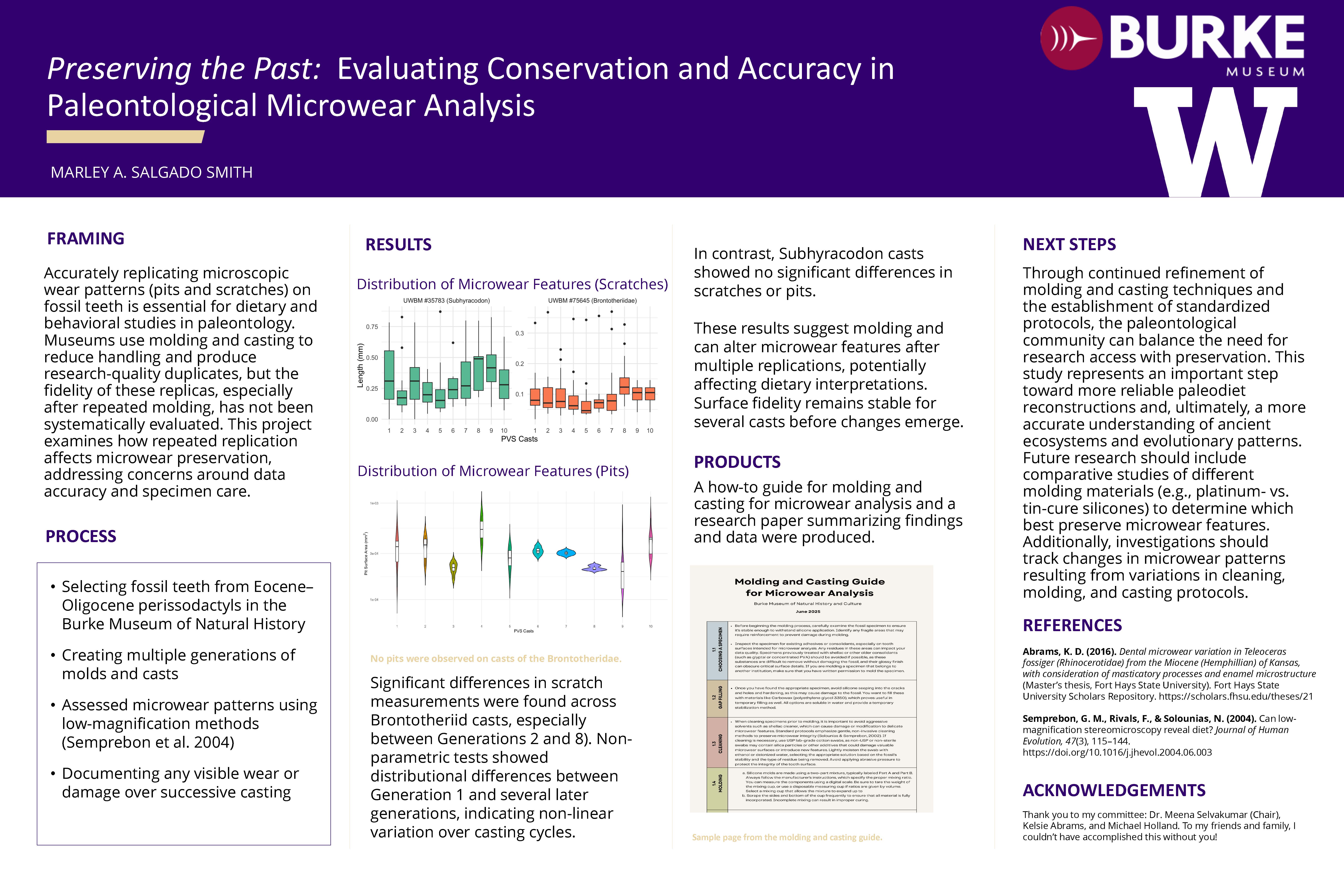 This research evaluates the reliability of dental microwear analysis through repeated molding and casting procedures on perissodactyl fossils. Statistically significant differences in scratch measurements were found across Brontotheriidae (UWBM #75645) casts (F (9, 203.79) = 2.01, p = 0.039), particularly between Generation 2 and Generation 8 (mean difference = 0.0334, 95% CI [0.0014, 0.0654], p_adj = 0.0330). Non-parametric analysis further revealed significant distributional differences between Generation 1 and Generations 2 (p = 0.0018), 5 (p = 0.0045), 9 (p = 0.0129), and 10 (p = 0.0129). In contrast, no significant differences were found among Subhyracodon (UWBM #35783) casts for either scratch (F (9, 88.40) = 1.17, p = 0.327) or pit measurements (F (11, 54.10) = 1.740, p = 0.089). These findings suggest that the molding and casting process can introduce both mean-level changes and distributional shifts in microwear features after multiple replication cycles, potentially affecting dietary interpretations. The observed differences between Generation 2 and 8 indicate that surface fidelity remains relatively stable for several replications before detectable changes emerge. Given the importance of microwear in reconstructing short-term feeding behavior and ecological change, even subtle distortions may compromise analytical accuracy. This research emphasizes the need for standardized molding and casting protocols and recommends best practices to reduce error and improve consistency in paleodietary studies.