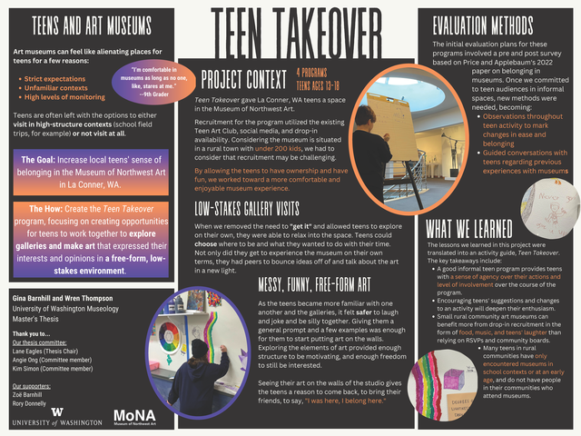 Teen Takeover is a project that aspired to cultivate teen belonging in a rural art museum. This project consisted of a space-making program, shifting the context of gallery visits, and observing the impacts of these practices on participating teens’ senses of belonging in the space. Art museums’ environments and unspoken rules can be alienating for visitors, especially teens. We wanted to challenge this by creating a participatory-designed program for teens within the Museum of Northwest Art. Our primary activity involved wall-drawing in a community art studio. Teens were invited in, provided food and music, and provided a prompt for the day’s activities. Our secondary activity involved bringing familiar, low-stakes games (such as hangman and pictionary) into the museum’s gallery spaces. These activities’ balance of structure and freedom allowed teens to bring themselves to the space without judgment. They flowed between activities and comfortably existing in the space. With no strict expectations on the product or understanding, the teens brought in references to their favorite media, jokes, and genuine effort to the program’s activities.