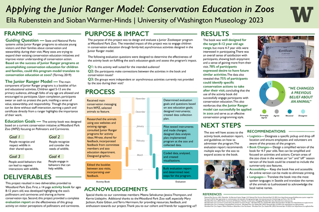 While zoos look for new ways to expand and improve on their conservation education, National and State Parks systems utilize Junior Ranger programs to create lasting, impactful conservation education on children and their families. This project set out to test if a Junior Ranger program at a zoo would mirror the proven success of this model at instilling a sense of stewardship, responsibility, and care. Based on the 2023 conservation education goals of Woodland Park Zoo, an activity book focusing on pollinators and carnivores was created. The book was designed for 8-12 year olds to complete with their families during their visit. It included fun, educational activities that brought folks all over the zoo and engaged participants to take part in conservation action. The book was then implemented and evaluated for its efficacy. Through the evaluation, it was found that return visitors, especially returning members, were most likely to participate. Additionally, the data showed that most participants could identify at least one specific conservation action to take at home. Overall, participants were eager to use the book or a similar activity again during future visits. The final activity book and evaluation report outline how the zoo can continue to provide this independent activity and adapt it for future use.