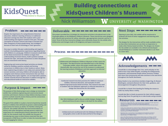 Children's learning of history in traditional education settings has often left students with a poor understanding and negative outlook of the past. One way to combat this problem is by building positive experiences with children starting at a young age. Children’s museums as places of informal multidisciplinary learning have a demonstrated ability to inspire these positive experiences. As such, they are the ideal environment for children to begin their understanding of ancient history, build a positive outlook towards the topic, and make connections to other disciplines that are interwoven with history. The purpose of this thesis project was to design an interactive exhibit that combined engineering and construction-based activities with historic themes. This project provided four designs for interactive activities situated next to the Cityscapes gallery at KidsQuest Childrens Museum in Bellevue, Washington. These interactives were designed with industry best practices for safety, education, age-appropriate material, and fun in mind. The goal of for these interactive being to help children develop more positive experiences with history, and the connections it has with our modern world. Three of the four designs were ultimately chosen and will open in the exhibit in June 2022. The museum will monitor these activities to better understand visitor engagement. This project should serve as a model for any other children's museums who want to connect history educational materials with their existing exhibits and offerings.