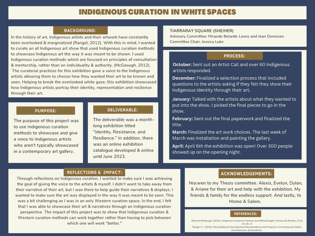 For this project, I curated a month-long exhibition that showcased 3 Indigenous artists. I used Indigenous curation methods to show that Indigenous and Western curation can be used in the same spaces and there isn’t a right or wrong way. While there is no firm definition of Indigenous Curation Methods, a lot of the ways are about collaboration, storytelling, and Indigenous Ways of Knowing. Each of these components played a huge part in the creation of the art show, titled “Identity, Resistance, and Resilience.”