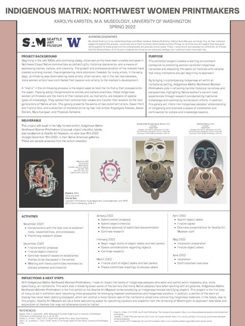 Indigenous Matrix: Northwest Women Printmakers is an exhibition hosted at Seattle Art Museum that runs from June 15th, 2022 through December 15th, 2022. Curated by an Indigenous female scholar, this exhibit is a first for the museum, prompting increased accessibility for emerging museum professionals of color. This gallery presents the works of two prominent artists, Susan Point and Francis Dick, and a selection of stonecut prints by four Inuit artists: Angotigolu Teevee, Jessie Oonark, Myra Kukiiyuat, and Pitseolak Ashoona. Curating and exhibiting Native artists such as these within a museum setting broadens and promotes the discussions that Museology professionals are having regarding diversity, equity, and inclusion. Additionally, the public will encounter works of art in Seattle Art Museum’s collection that have yet to be displayed within the galleries. Visitors will step away from the exhibit with a better understanding and appreciation of the Indigenous communities that call the Northwest their home.