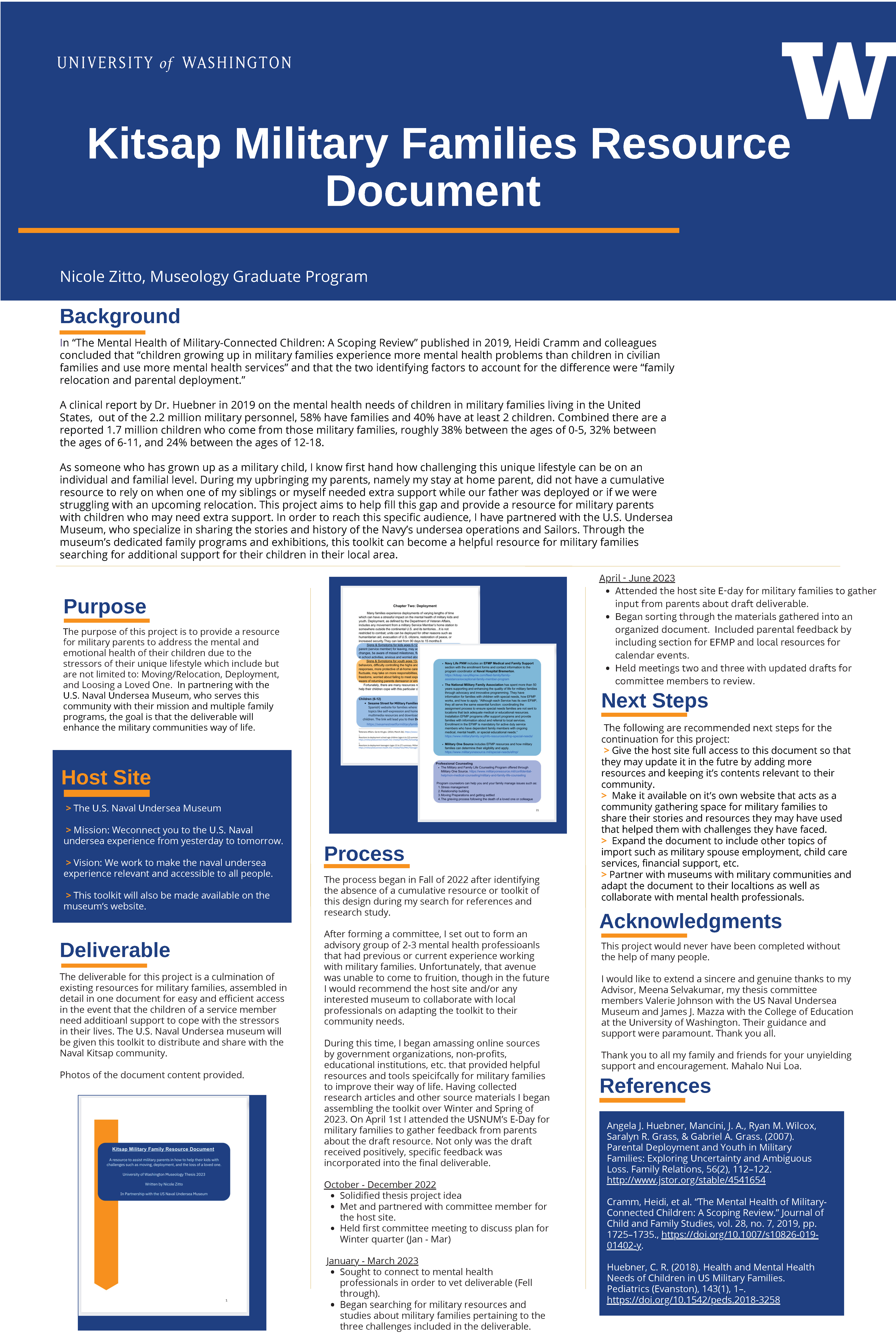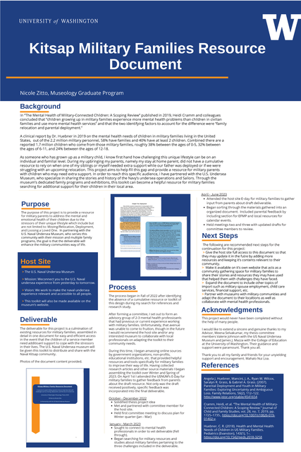For anyone who is a part of the U.S. Armed Forces they know how difficult this unique lifestyle can be, whether they are the service member or the child of one. Many of the issues that military families face on a daily basis are spousal unemployment, lack of child care, constant relocation, deployments, education and behavioral development, and others. Despite the fact that there are many government sponsored resources and nonprofit organizations dedicated to serving these families, not many of them are user friendly and it is time consuming to search them. The purpose of this resource document is to compile specific resources in one location for parents to refer to if their child or children are experiencing difficulties with moving (relocation), deployments, and if they have lost a loved one. It will also include specific resources to the Naval Base Kitsap in Bremerton, WA with the intention to serve the families who live there so they can utilize the resources in their own community.