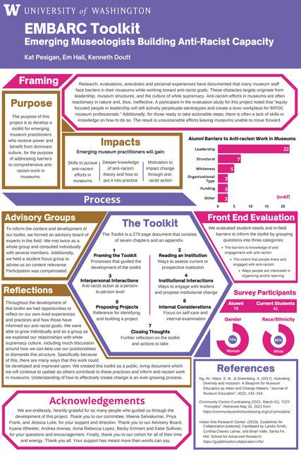 The purpose of this project was to develop a toolkit for white and coercively privileged emerging museum practitioners who want to take anti-racist action with or without institutional support. This toolkit is designed to help translate the process of personal learning into action through the use of scripts and templates, scenario prompts, and strategies for proposing projects to leadership. This toolkit is not, itself, anti-racist; it is designed to allow an individual to pursue anti-racism in the context of museums as they currently stand while acknowledging that our livelihoods often depend on remaining employed. As such, this toolkit offers strategies that accommodate oppressive structures throughout museums.