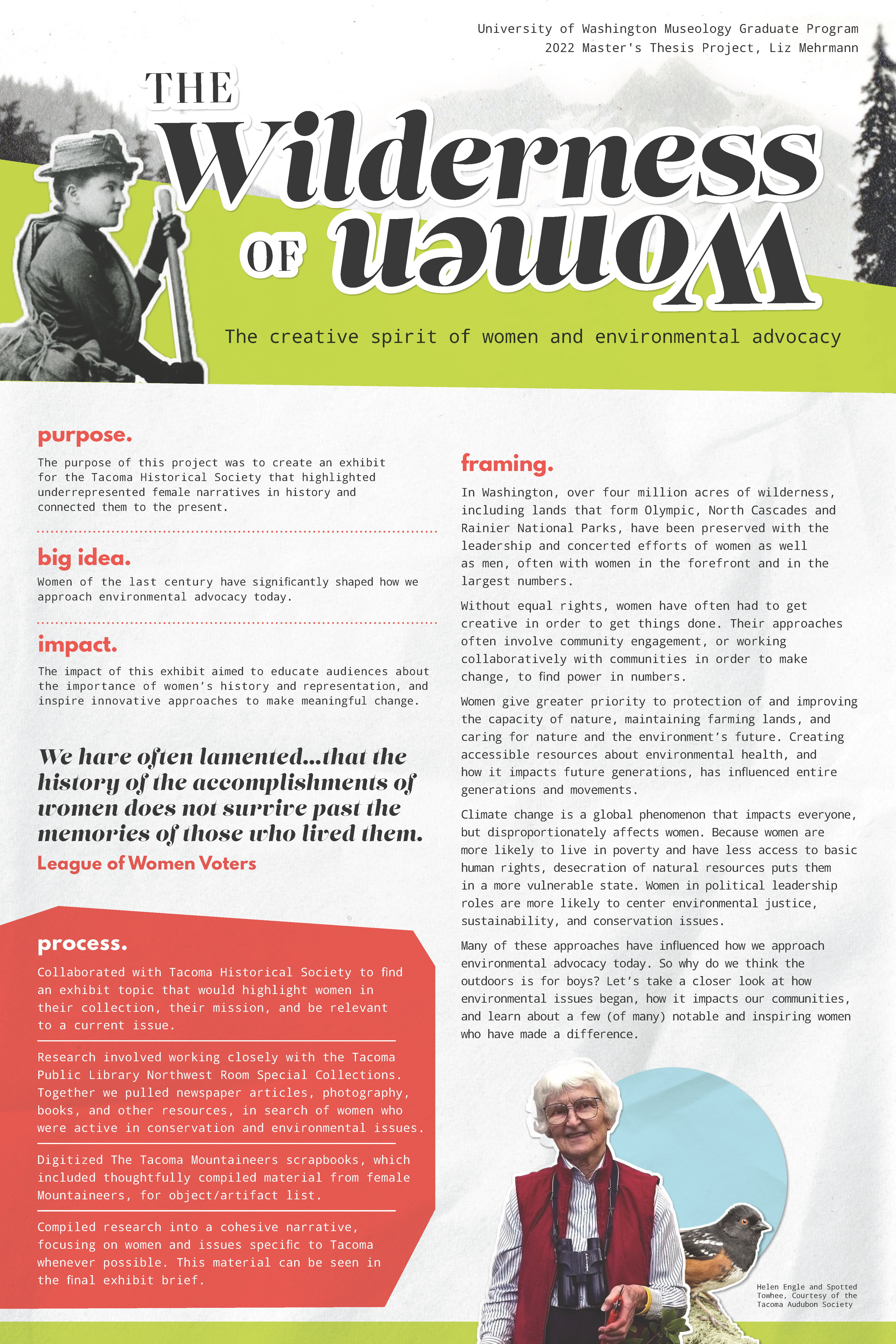The purpose of this project was to create an exhibit for the Tacoma Historical Society that highlighted underrepresented female narratives in history and connected them to the present. Women of the last century have significantly shaped how we approach environmental advocacy today, though these narratives are seldom featured in environmental history. Western territories' early passage of women’s suffrage suggests that a progressive stance on women’s rights may have been a reason why women were so active in environmental policy. Historically, women of Washington have been outdoor enthusiasts, prioritized environmental health & conservation, advocated for their communities, and addressed issues of environmental justice. These approaches greatly differed from the overwhelmingly male-dominated leadership of frontiersmen, which focused primarily on wealth and conquests. This approach did not consider the impact of these industries on the environment, or the holistic repercussions these industries would have. While women in Western territories did have access to early suffrage, and expressed their right to vote, they still needed to exercise creative means to tackle issues that contradicted money-making industries; such as corrupt leadership, pollution, and community rights. These creative means often involved finding power in numbers; educating the public, alliances with like-minded groups, or influencing male leadership (who would go on to take credit for those efforts). This virtual exhibit featured a timeline of Tacoma’s industry and population growth, the impact of those variables, profiled notable women in environmental advocacy, and emphasized their community-centered mindset. The exhibit aimed to educate audiences about the importance of women’s history and representation, and inspire innovative approaches to make meaningful change.