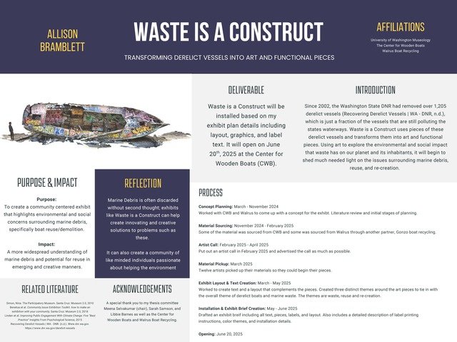 Waste is a Construct is an exhibit hosted at the Center for Wooden Boats located in Seattle, Washington, opening on June 20th, 2025. The pieces in the exhibit are made from derelict vessels, and are a combination of art and functional pieces. The main goals are to educate and bring light to the issue of derelict vessels and marine debris as a wider concept. Using art to explore the environmental and social impact that waste has on our planet and its inhabitants, it will begin to shed much needed light on the issues surrounding marine debris, reuse, and re-creation.