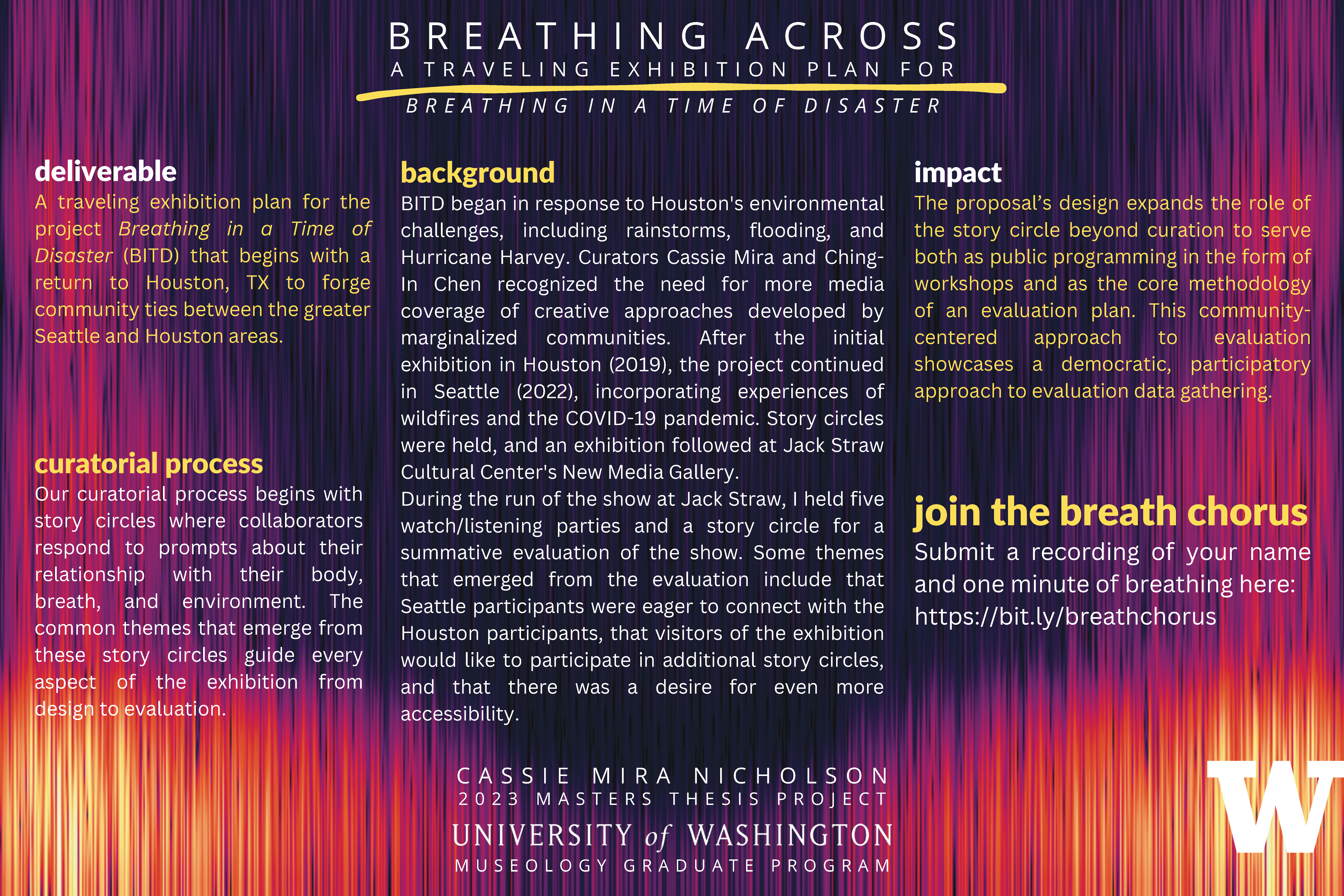 Breathing across, A Traveling Exhibition Proposal for Breathing in a Time of DisasterCloseImagePreviewPreview image “Breathing across, A Traveling Exhibition Proposal for Breathing in a Time of Disaster”Breathing across, A Traveling Exhibition Proposal for Breathing in a Time of DisasterUploaded July, 2023Tags listtagsstory circlestraveling exhibition proposalbreathenvironmentcommunitylane eagles