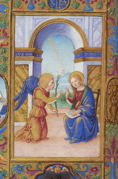 The scene of the Annunciation where Gabriel speaks with Mary. Gabriel is holding a lily.