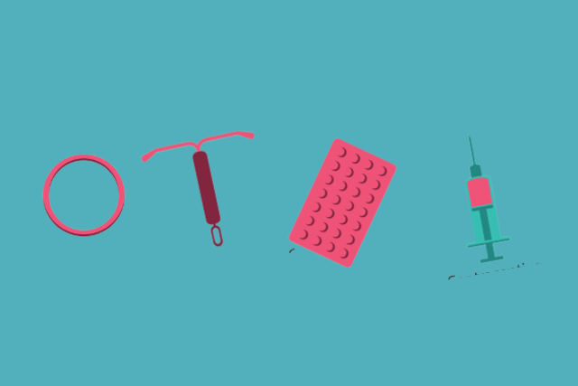 Drawings of four types of hormonal contraceptives. Vaginal ring, IUD, pills, and the contraceptive shot. Action Canada for Sexual Health & Rights website.