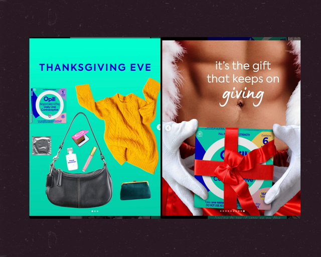 Instagram posts from @opill_otc on November 22, 2024, and December 26, 2024